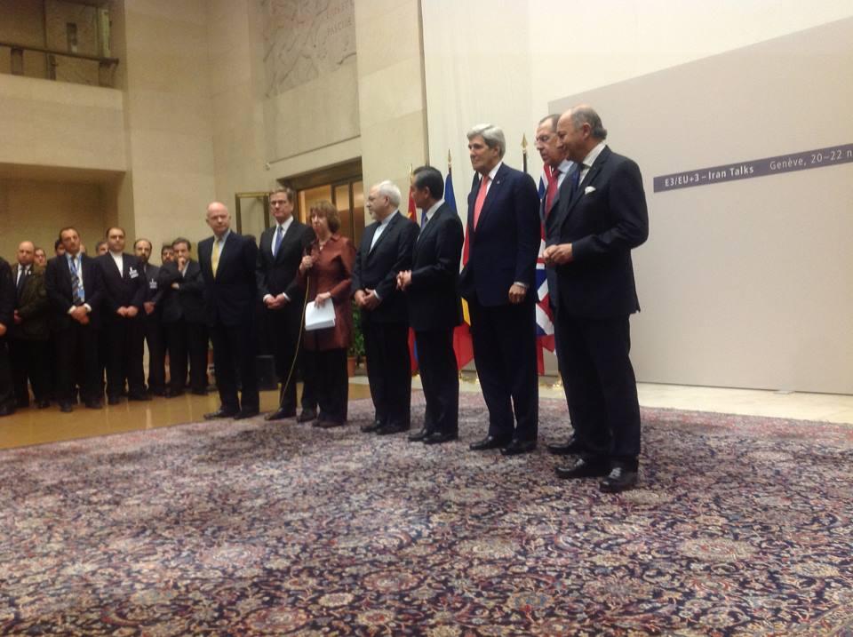 les ministres des Affaires étrangères des 5+1, Lady Ashton et le ministre iranien des Affaires étrangères présentant le résultat de l'accord (crédit : ministère russe des Affaires étrangères)