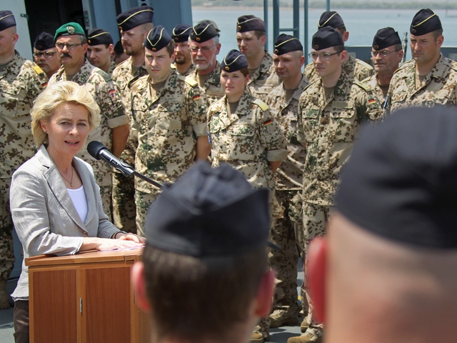 La ministre von der Leyen en visite à Djibouti aux troupes allemandes engagées dans la force européenne anti-piraterie (Crédit : Min. allemand de la Défense)