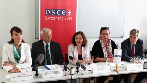 Lr-: Nina Shtanski, Political Representative for Transdniestria; Radojko Bogojević, Special Representative of the OSCE Chairperson-in-Office; Tatyana Baeva, OSCE Press and Public Information Officer; Jennifer Brush, Head of the OSCE Mission to Moldova; and Eugen Carpov, Political Representative for Moldova, at a press conference following formal "5+2" talks, Vienna, 6 June 2014. (OSCE)