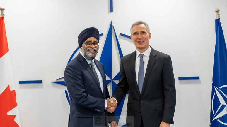Harjit Singh Sajjan, Ministre canadien de la Défense, dont le pays est à la tête du commandement de la mission de l'OTAN en Irak et Jens Stoltenberg, Secrétaire général de l'OTAN (crédit : OTAN)