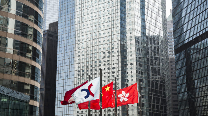 Des drapeaux, de Hong Kong et de la Chine notamment, au pied de Exchange Square dans le quartier du centre financier (Crédit : Commission européenne)