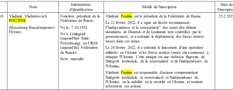 (B2) En même temps que l’inscription sur liste noire de membres de la Douma, l’Union européenne a décidé vendredi (25 février) de geler les avoirs et d’interdire d’entrée dans l’Union…