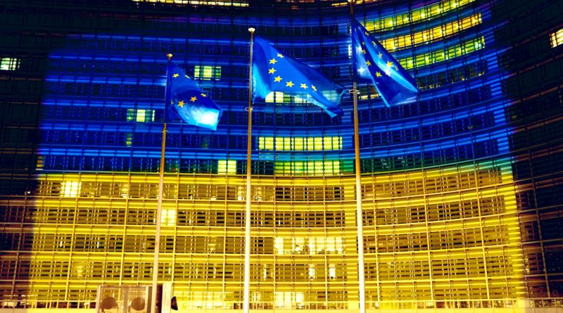 Le Berlaymont arbore les couleurs bleue et jaune du drapeau ukrainien (photo : Comm. Europ.)