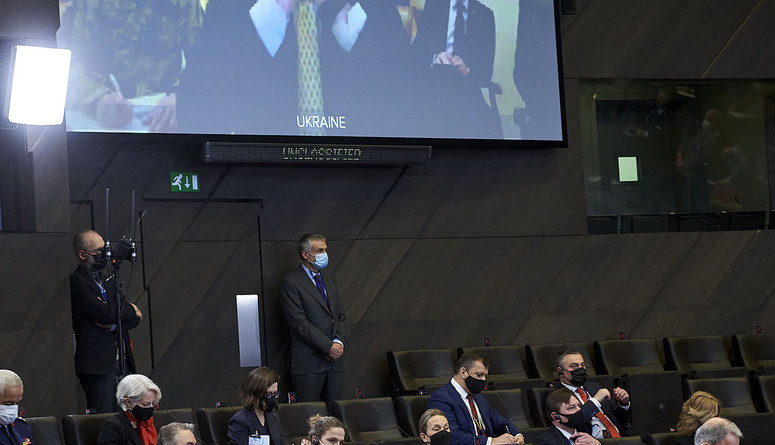 Le ministre ukrainien de la défense Oleksii Reznikov était en visio-conférence avec ses homologues de l'OTAN jeudi (17 février) (Photo : OTAN)