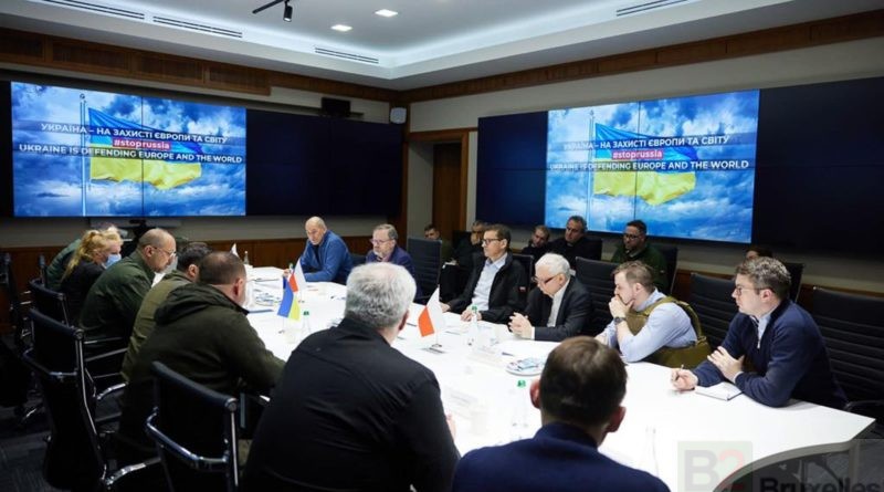 Les trois dirigeants polonais, tchèque et slovène à Kiev avec leurs homologues ukrainiens (Crédit : PM Pologne)