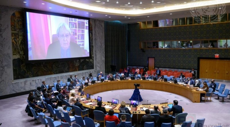 Le Secrétaire général adjoint aux Affaires humanitaires et Coordonnateur des secours d'urgence de l’ONU, Martin Griffiths à l'écran lors d'une session du Conseil de sécurité de l'ONU sur la Syrie, le 20 mai 20222 (Photo: ONU/Loey Felipe)