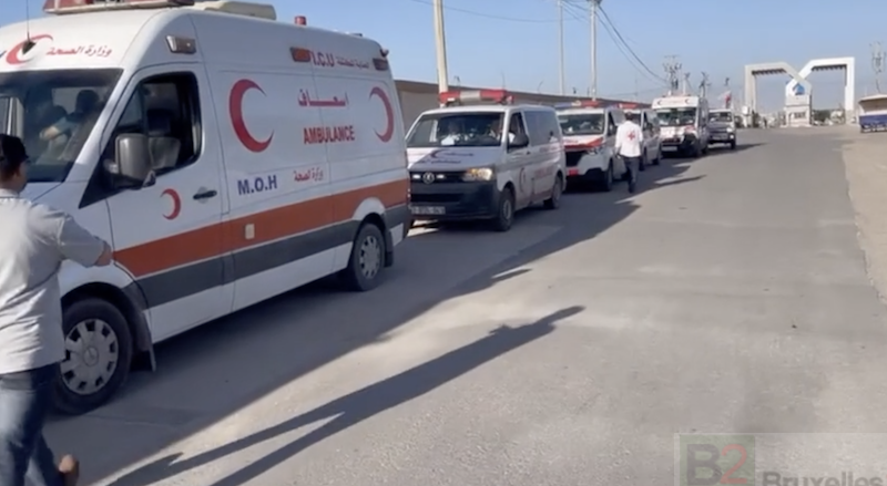 Convoi d'ambulances du croissant rouge palestinien au poste frontière de Rafah le 8 novembre (Flux vidéo : CICR / Sélection B2)