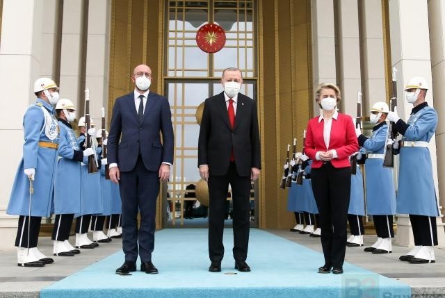 Charles Michel, Recep Erdogan et Ursula von der Leyen avant leur rencontre (Crédit : Commission européenne)