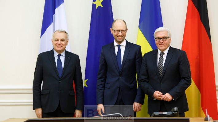Ayrault, Steinmeier à Kiev, aux cotés du Premier ministre ukrainien Iatseniouk qui a réussi à rester en poste (crédit : MAE allemand / U. Grawobsky)