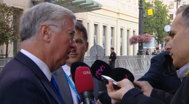 Dès son arrivée, M. Fallon s'est dirigé vers quelques journalistes massés face à l'entrée, pour une intervention très préparée et très minutée (crédit : présidence slovaque de l'UE)