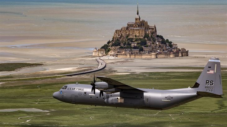 Un Super Hercules américain survolant les plages du débarquement à l'occasion du 73e anniversaire du débarquement (crédit : US Air Force/ Devin Boyer)