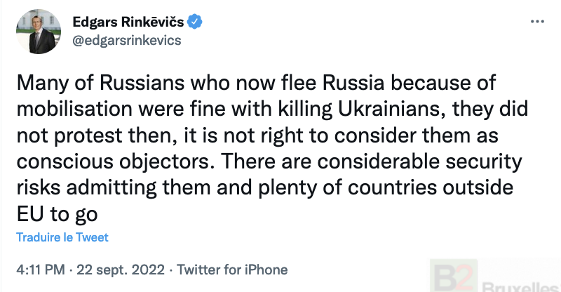 (B2) Accueillir ou ne pas accueillir les Russes refusant de faire la guerre de Poutine, les Européens sont partagés entre la nécessaire solidarité… et les menaces pour leur sécurité. Crainte…
