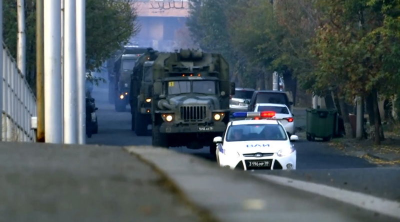 Véhicules de la 15e brigade motorisée - force de maintien de la paix russes en cour de déploiement vers le Haut Karabagh (crédit : MOD Russie 18.11)