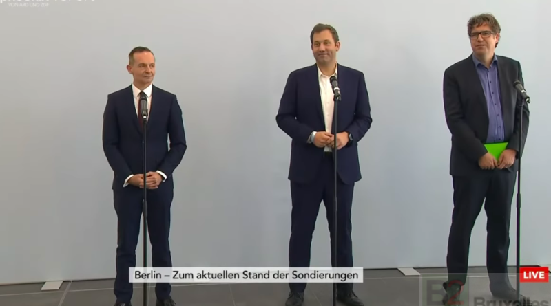 Les trois négociateurs — Volker Missing(FDP), Lars Klingbeil (SPD), Michael Kenner (Grünen) — annoncent l'accord préliminaire (Flux TV Phoenix - Sélection B2)