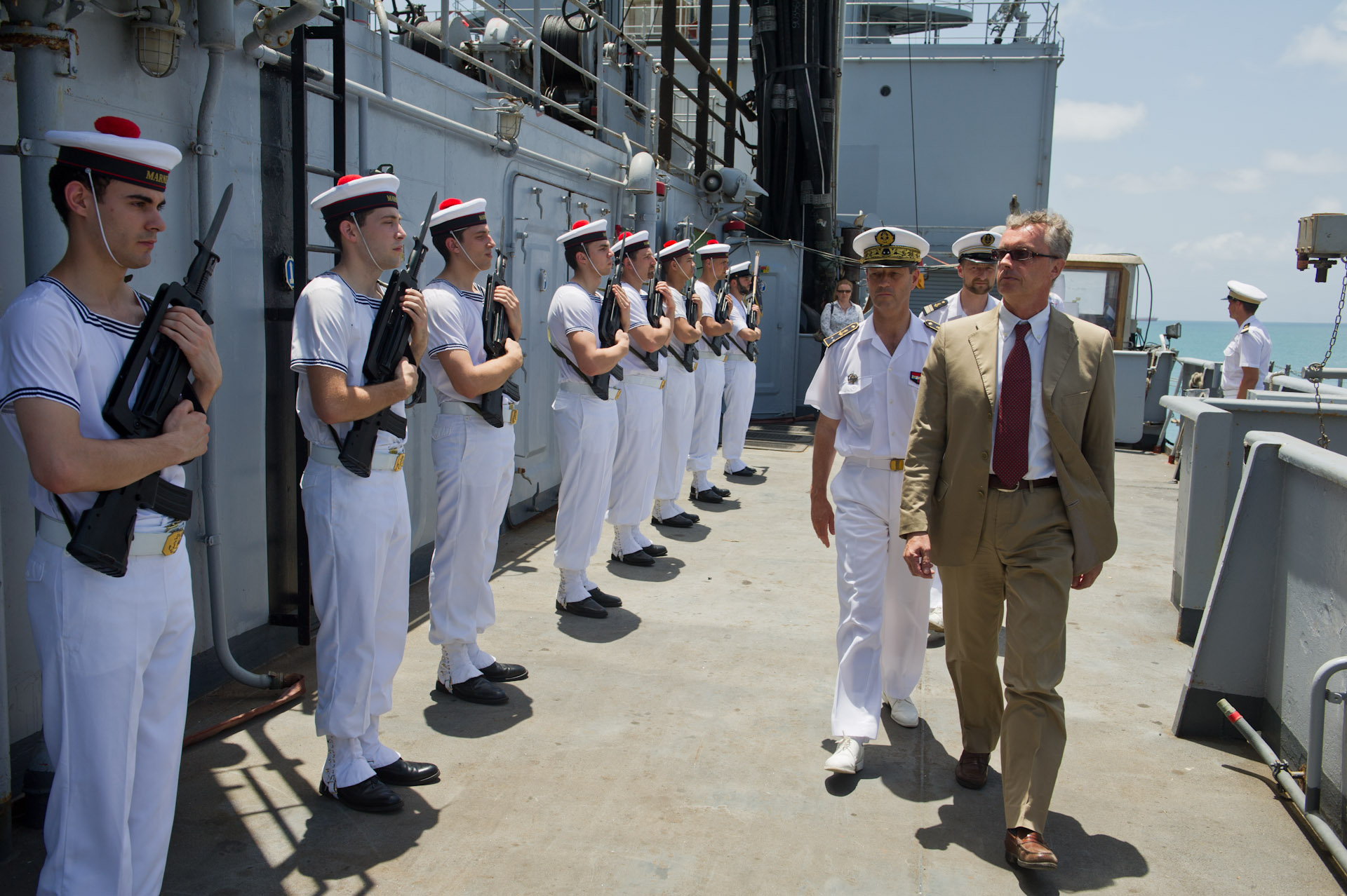 Nicolas Delcroix, le chef de la délégation de l'UE à Djibouti, passe en revue les troupes du Marne, qui font escale dans le petit Etat de l'Océan indien (crédit : marine française)