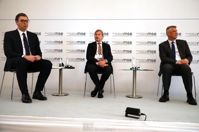 Hashim Thaci a été un interlocuteur clé des Européens dans le dialogue Belgrade Pristina, ici avec son homologue serbe A. Vucic et le commissaire J. Hahn (crédit : Commission européenne, février 2019, Münich)