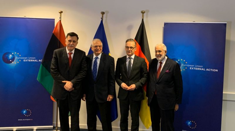 Fayez Al-Sarraj, Premier ministre libyen, Josep Borrell, Haut représentant de l'UE, Heiko Maas, ministre allemand des Affaires étrangères, et Mohamed Taha Siala, ministre libyen des Affaires étrangères, à Bruxelles, lors de leur rencontre (crédit : SEAE)