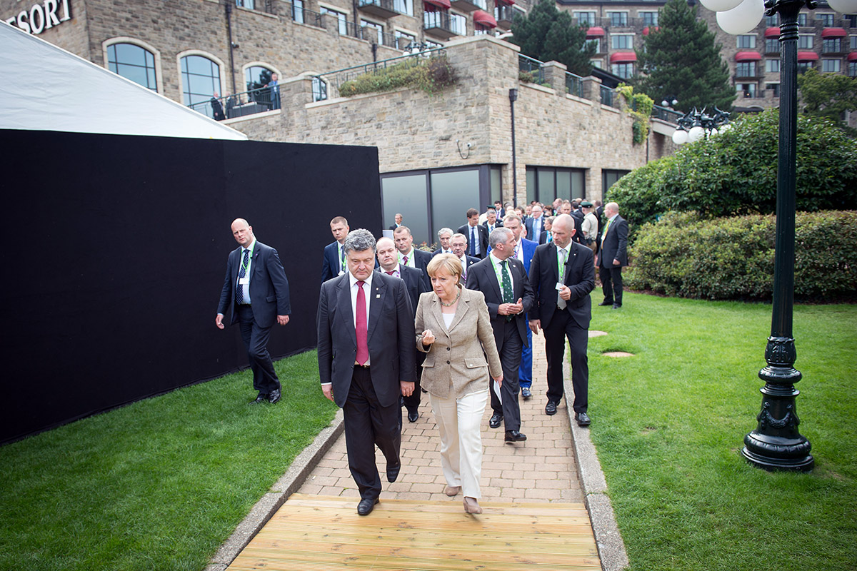 Des sanctions réversibles que si un ensemble d'actes sont mis en oeuvre, précise Angela Merkel, ici à Newport avec Porochenko (crédit : Bundesregierung)