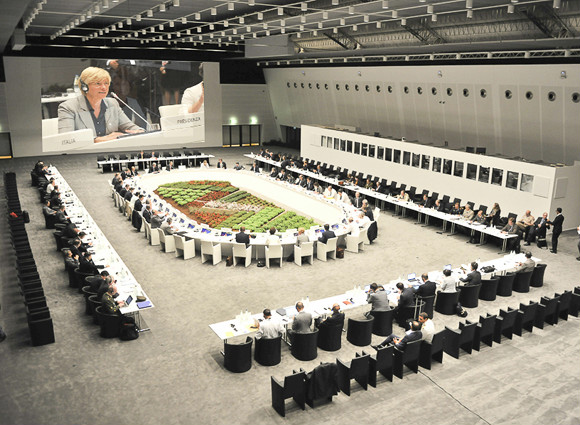 la salle de réunion des ministres de la Défense à la foire internationale de Milan (crédit : Présidence italienne de l'UE)