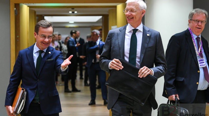 U. Kristersson (Suède) et K. Karins (Lettonie) à l'entrée du Conseil (présidence suédoise de l'UE)