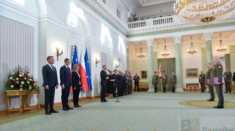 Le président A. Duda, avec ses cotés M. Morawiecki (premier ministre) et M. Blaszcak (ministre de la défense) adoube les généraux W. Kukula et M. Klisz dans leurs nouvelles fonctions (photo : Gouv PL)