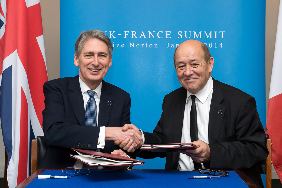 Phil Hammond et Jean-Yves Le Drian échangeant leurs mains après leurs signatures (crédit : MOD UK)