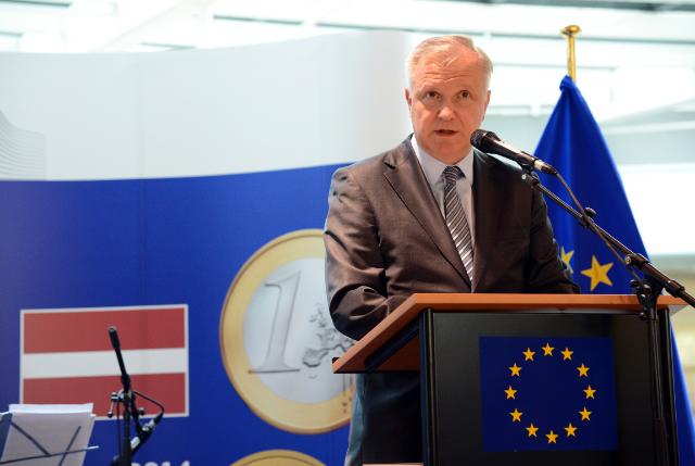 Olli Rehn en Lettonie pour la mise en place de l'euro (crédit : Commission européenne, juillet 2013)