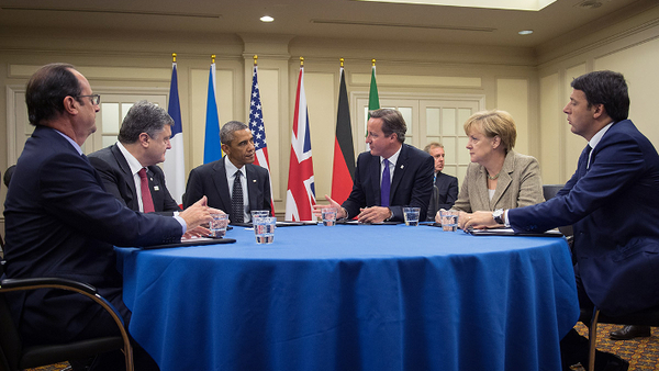 Le président Porochenko dans une discussion préliminaire avec les 5 dirigeants (Obama, Cameron, Merkel, Hollande, Renzi) - Crédit : Bundesregierung
