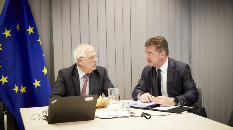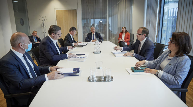 Aleksandar VUČIĆ, President de la Serbie, Miroslav LAJCAK, Représentant spécial de l'UE pour le dialogue, Josep BORRELL FONTELLES, Haiut représentant de l'UE, et Avdullah HOTI, Premier ministre du Kosovo, lors de leur réunion (crédit : Conseil de l'UE)