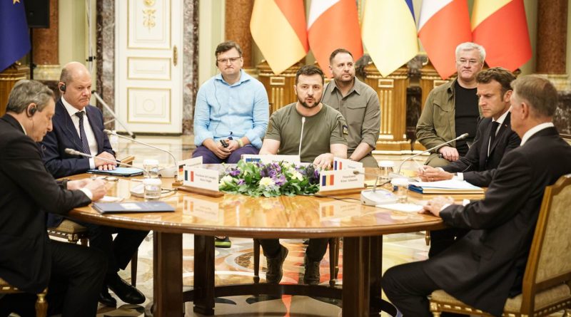 K. Iohannis, M. Draghi, V. Zelensky, E. Macron, O. Scholz à Kiev lors de la conférence de presse (Photo : Chancellerie allemande - pool)